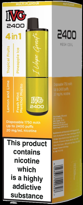 IVG 2400 Yellow Multi-Pack has 4 different tropical flavours in 1 Disposable! Each pod provides a unique and refreshing taste experience, perfect for those who enjoy a mix of juicy and exotic flavours.